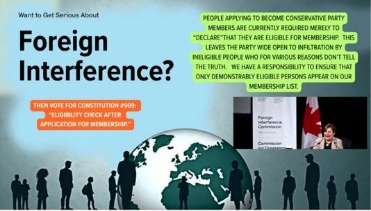 This proposal addresses a vulnerability in the Conservative Party of Canada's membership process: applicants must self-declare eligibility (as Canadian citizens or permanent residents), but the Party lacks effective verification to confirm these claims are true. This exposes the Party to potential infiltration by ineligible individuals seeking influence, such as voting in nomination contests. Standard ID (e.g., driver's licence) only verifies identity, not eligibility. To genuinely prevent foreign interference in Party affairs, the Party must implement measures to ensure only demonstrably eligible persons are on the membership list, though the proposal does not dictate specific methods.